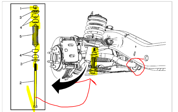 In pic 2, I highlighted the stabilizer link and where the sway bar bushing is located. Note there is one on each side. Place your hand on the sway bar to see if you can fill a vibration when it is bounced. Also, the link can be broken as well. It isn't uncommon, so visually inspect the components.