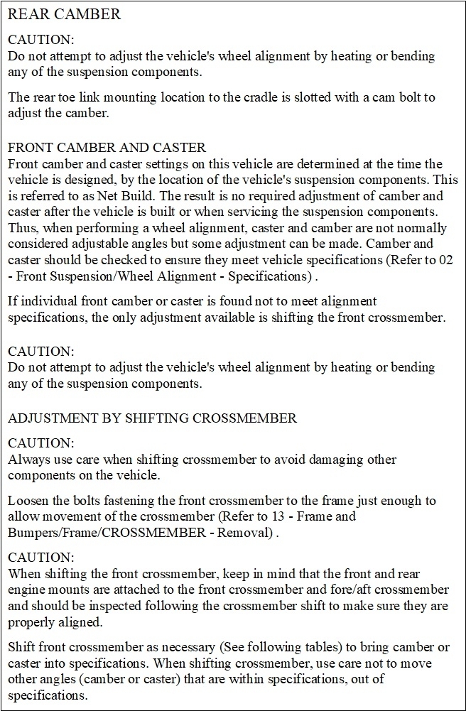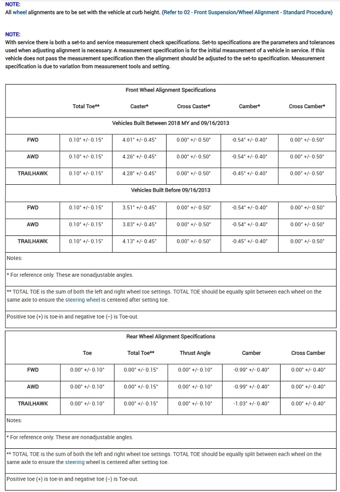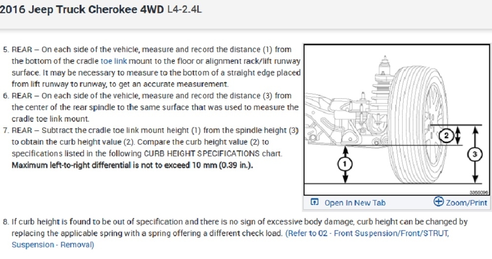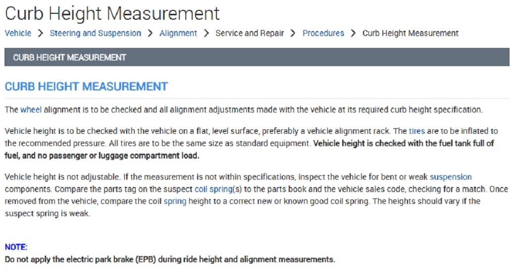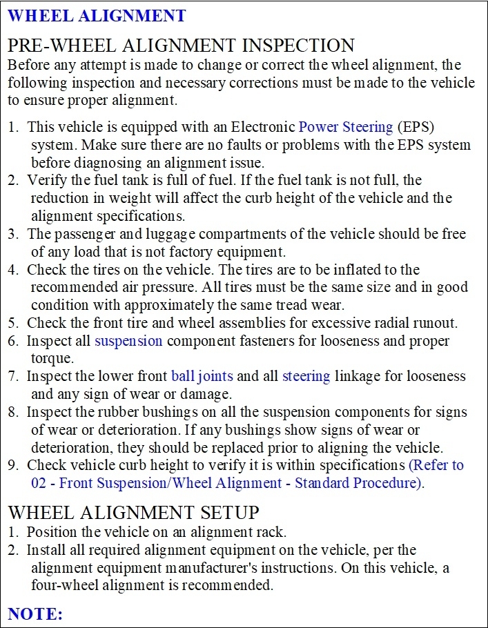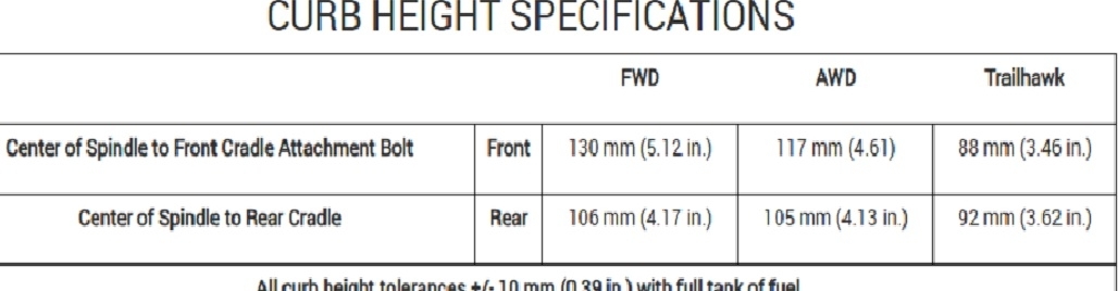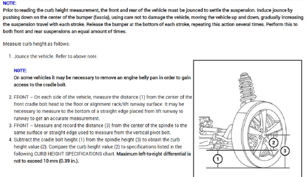One thing I forgot to mention is the procedure for checking ride height. It looks complicated, but Chrysler has done it this way since at least the 1970s. Imagine if the height adjustments were perfect, then you drive all four tires up onto pieces of 2"x6" lumber. Most manufacturers have you measure from one specified point, often on the bumper or to a side marker light. By driving onto pieces of lumber, every measuring point will be 1 1/2" too high, yet nothing has changed the geometric relationship of the suspension parts. Chassis ride height hadn't changed. The same error occurs when you switch to an optional tire size. Now you have to know that was done, and you have to correct for that. With Chrysler's method of taking two readings and calculating the different, tire size doesn't matter. You're ending up with the correct reading that gives the correct geometric relationship of the steering and suspension systems