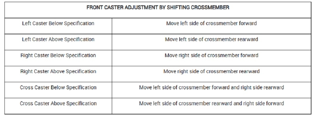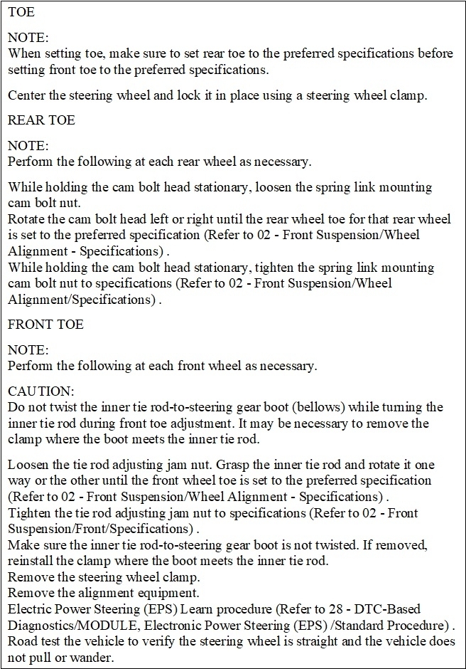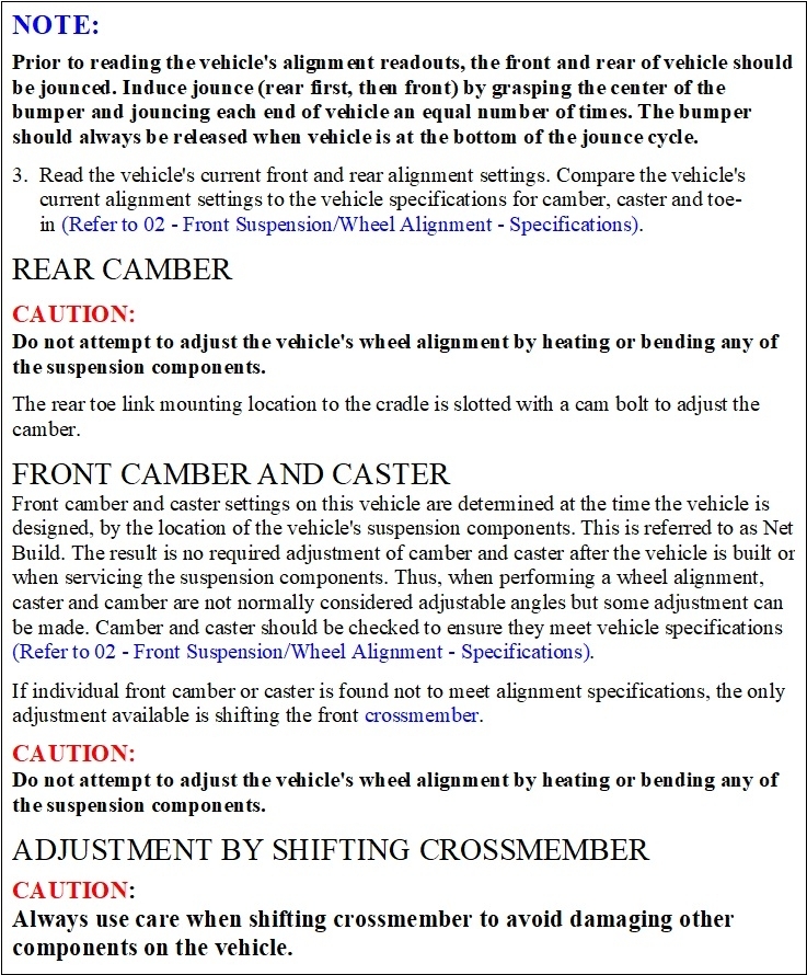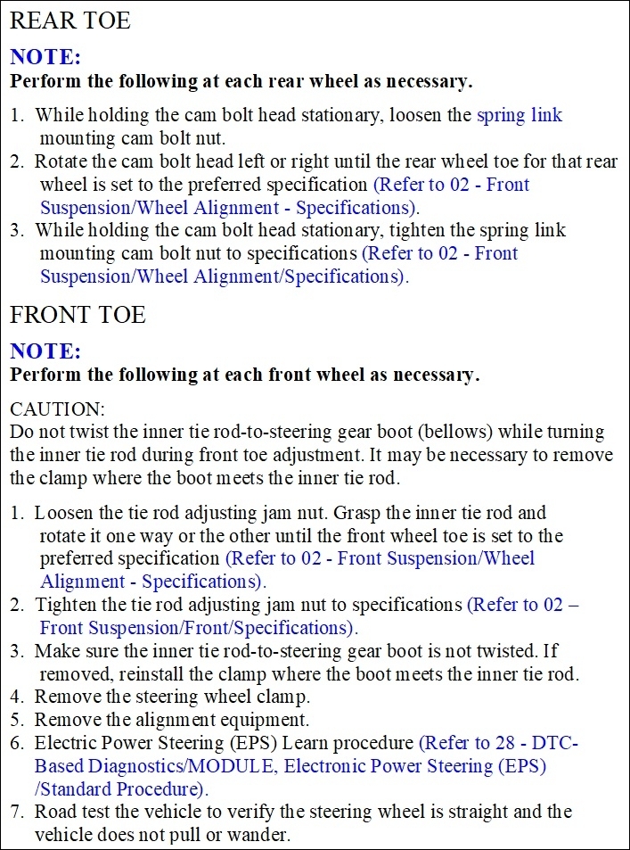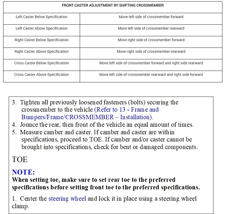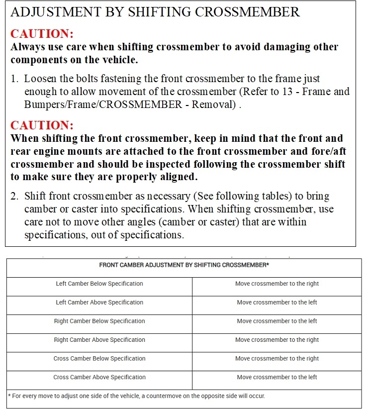 One thing I forgot to mention is the procedure for checking ride height. It looks complicated, but Chrysler has done it this way since at least the 1970s. Imagine if the height adjustments were perfect, then you drive all four tires up onto pieces of 2"x6" lumber. Most manufacturers have you measure from one specified point, often on the bumper or to a side marker light. By driving onto pieces of lumber, every measuring point will be 1 1/2" too high, yet nothing has changed the geometric relationship of the suspension parts. Chassis ride height hadn't changed. The same error occurs when you switch to an optional tire size. Now you have to know that was done, and you have to correct for that. With Chrysler's method of taking two readings and calculating the different, tire size doesn't matter. You're ending up with the correct reading that gives the correct geometric relationship of the steering and suspension systems