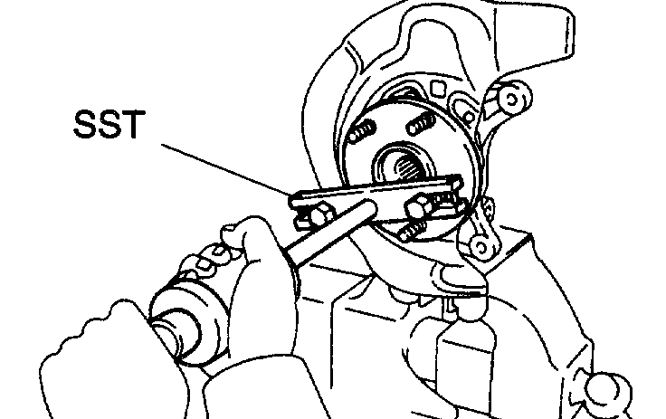 HINT: Align the holes for the ABS speed sensor in the dust deflector with steering knuckle.