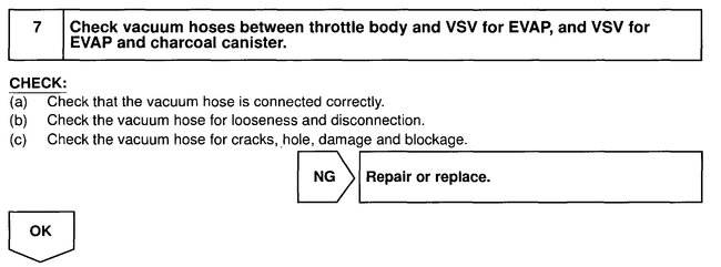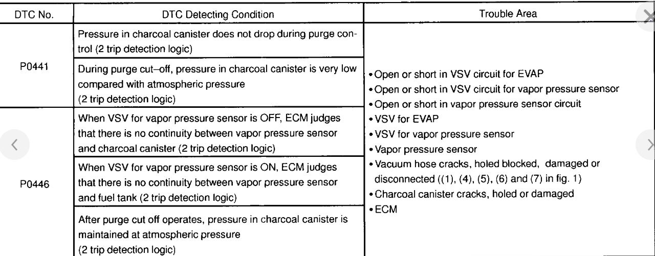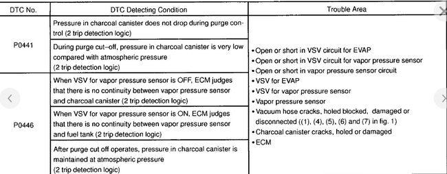 Picture 6 and 7 show component locations under the hood. Notice the components I am suggesting to check are right in the area you were working. Picture 6 shows locations of different components. Pic 7 is a legend of the parts listed. You need to check VSV components 3, 4, 6, 7, 8, 9. Any of these can cause the EVAP trouble codes.