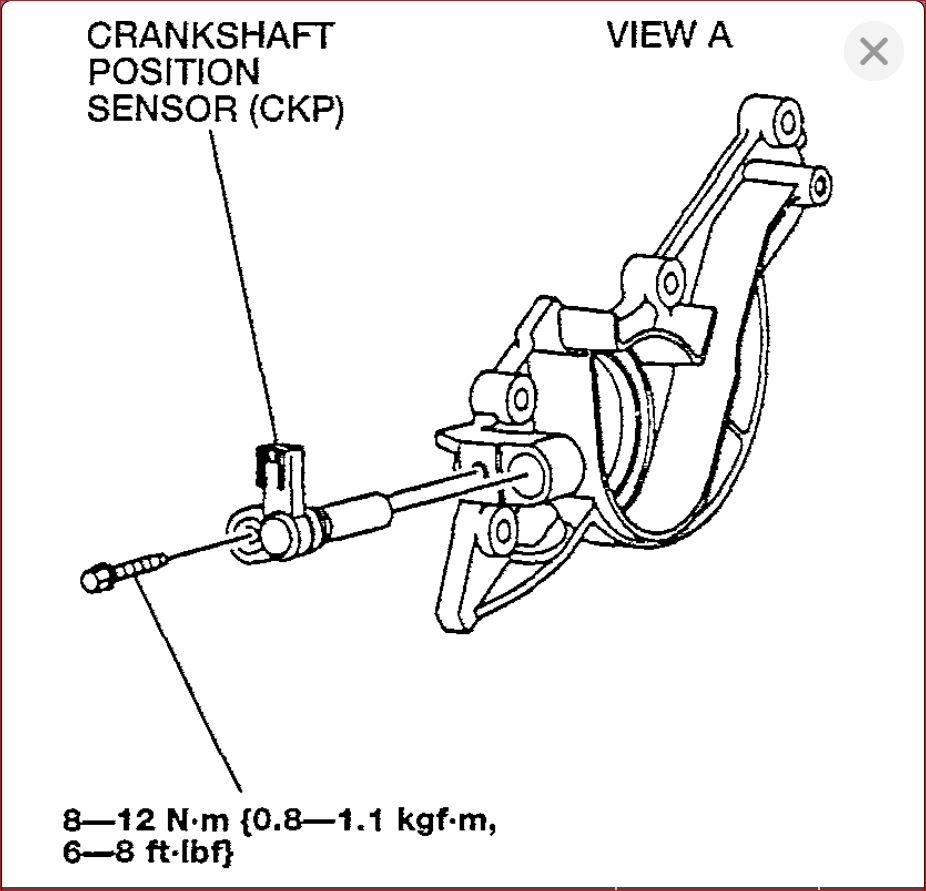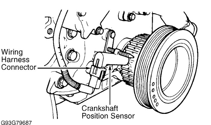 Disconnect negative battery cable. Remove alternator. Drain cooling system and remove water outlet tube. Disconnect crankshaft position sensor wiring harness connector. Remove sensor mounting bolt and pry sensor