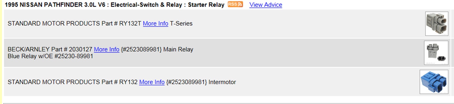 Alternate/OEM Part Number(s): 252300B000, 252300B060, 252300B080, 2523061A05, 2523061A10, 25230C9965, 25230C9970, 25230C9980, 25230C9985, 3F5Z14N089BA, F3XY14N089A, F3XY14N089C, F3XY9P704A this cross references with a standard ry63 here is what is listed under starter relays on rock auto. See pic