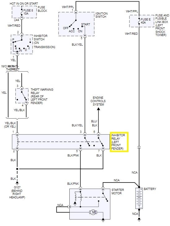 There is a relay on the Blk/Yellow between the Ignition switch and the Inhibit Relay. Up under dash behind fuse panel. I had a intermittent NO Crank (just click) and sometimes slow crank (like weak battery/Hi starter draw) The relay was the problem. it's not in the wiring diagrams. Took me 3 hrs to find, next time 10 mins.