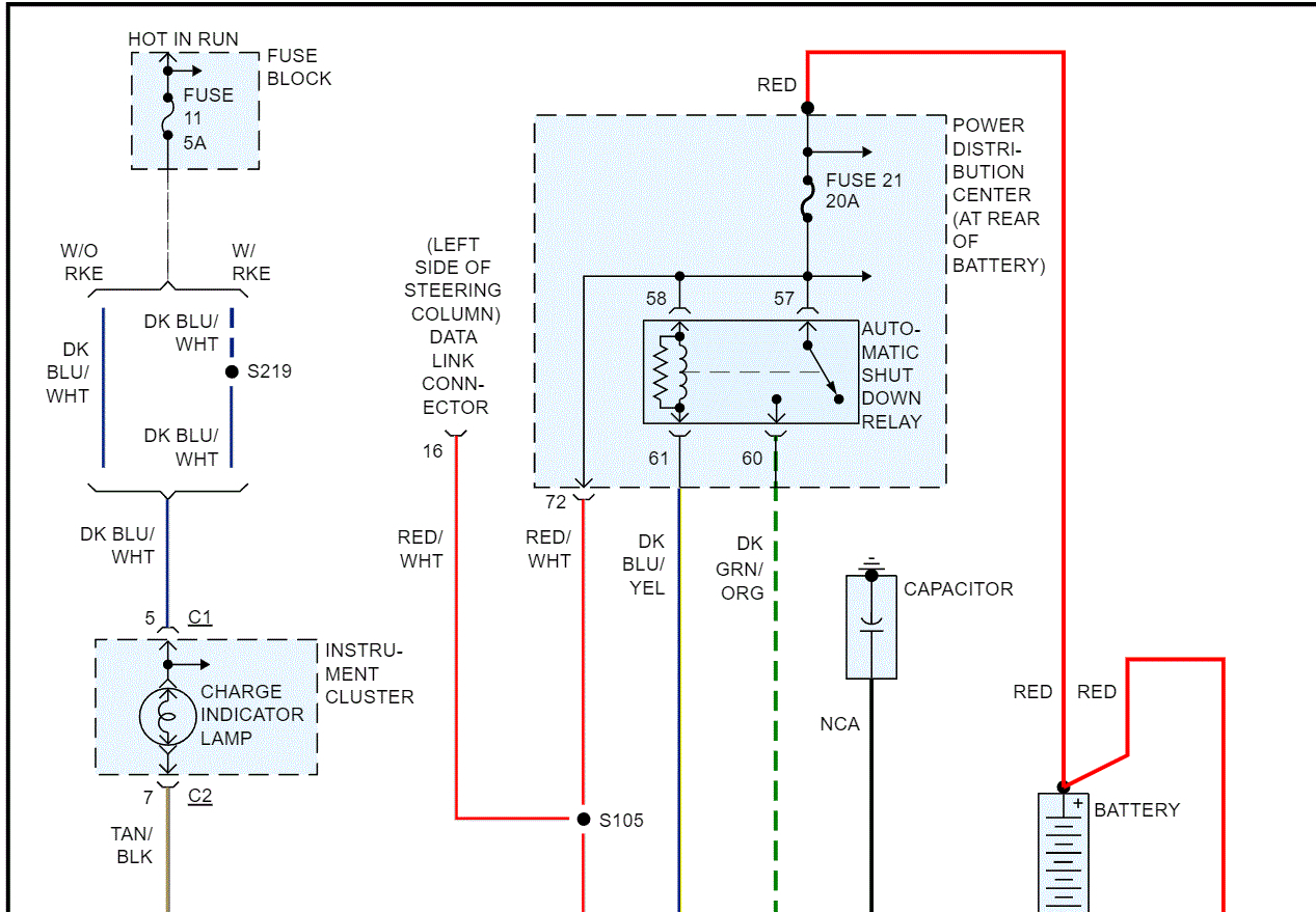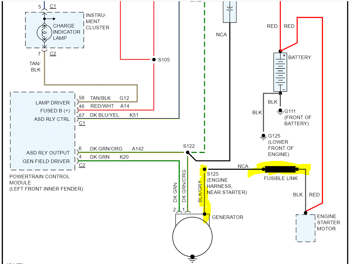 I attached the wiring schematic below for the charging system, so you have a reference. Note the wire I mentioned comes straight from the starter motor but in the middle of the wire, there is a fusible link.