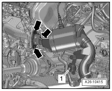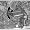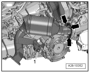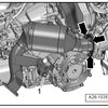 - Remove the nuts - arrows - and the bolt - 1 - and move the catalytic converter to the side.
