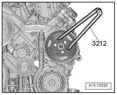- Remove the bolts for the coolant pump ribbed belt pulley, using a Wrench - Pin Type (3212) to counterhold.