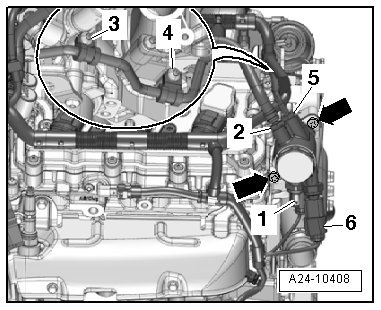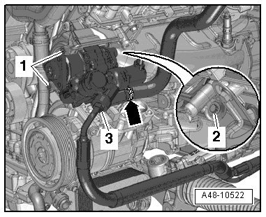 - Remove the upper coolant pipe. Refer to => [ Upper Coolant Pipes, Removing and Installing ] See: Coolant Line/Hose > Removal and Replacement > Upper Coolant Pipes, Removing and Installing.