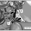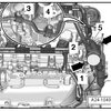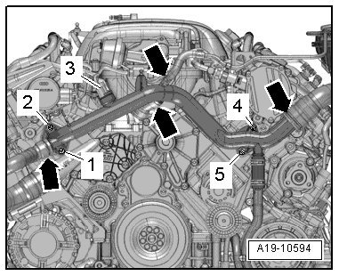 - Remove the bolts - 1, 2, 4 and 5 - on the front coolant pipe.