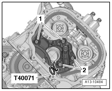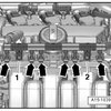 - Remove the bolts - 1 - and - 2 - and the right chain tensioner.