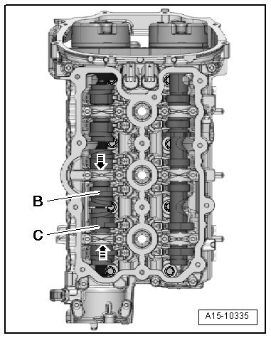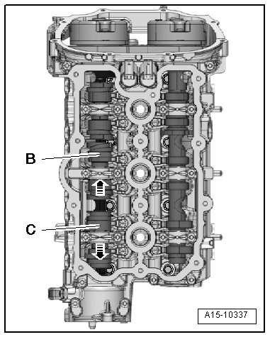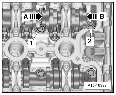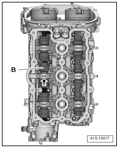 - Slide the unloaded camshaft slider - B - as far as the stop in the direction of the - arrow -.
