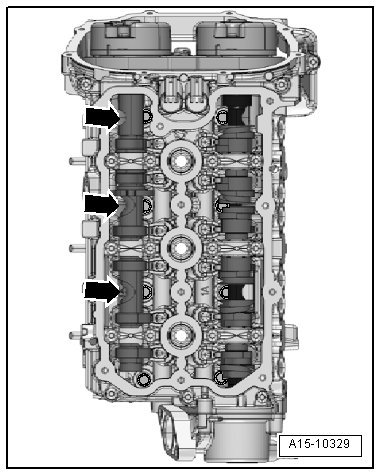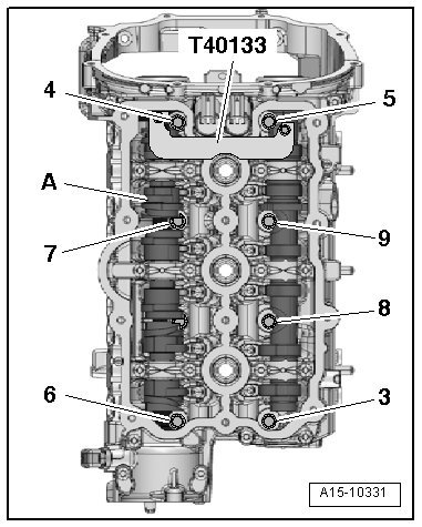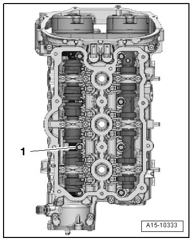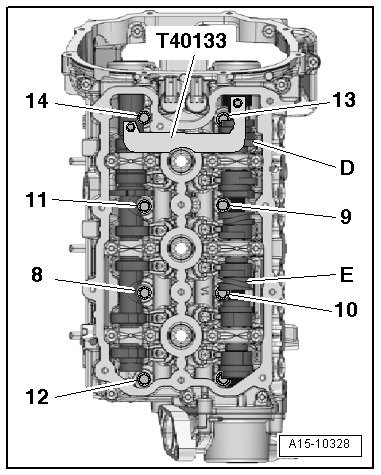 - Insert the bolt - 15 - and tighten it in 3 steps. Refer to => [ Overview - Cylinder Head ] See: Cylinder Head Assembly > Removal and Replacement > Overview - Cylinder Head.