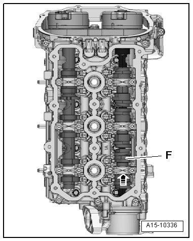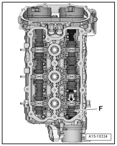 - Slide the unloaded camshaft slider - F - as far as the stop in the direction of the - arrow -.