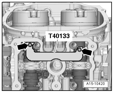 - Before installing the cylinder head, set the crankshaft and camshafts to "TDC" and install the Camshaft Clamp (T40133) on both cylinder heads and tighten to 25 Nm - arrows -.