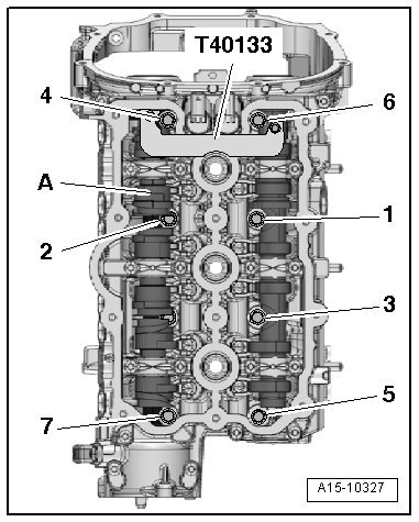 - Insert the bolts - 1 through 7 - while sliding the unloaded camshaft slider - A - accordingly.