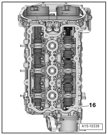 - Insert the bolt - 16 - and tighten it in 3 steps. Refer to => [ Overview - Cylinder Head ] See: Cylinder Head Assembly > Removal and Replacement > Overview - Cylinder Head.