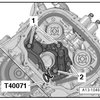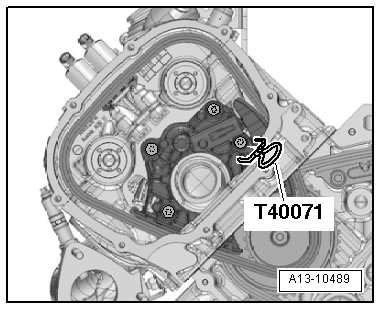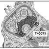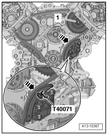 - Press the timing mechanism chain tensioner guide rail in the direction of the - arrow - and secure the chain tensioner using a Locking Pin (T40071).