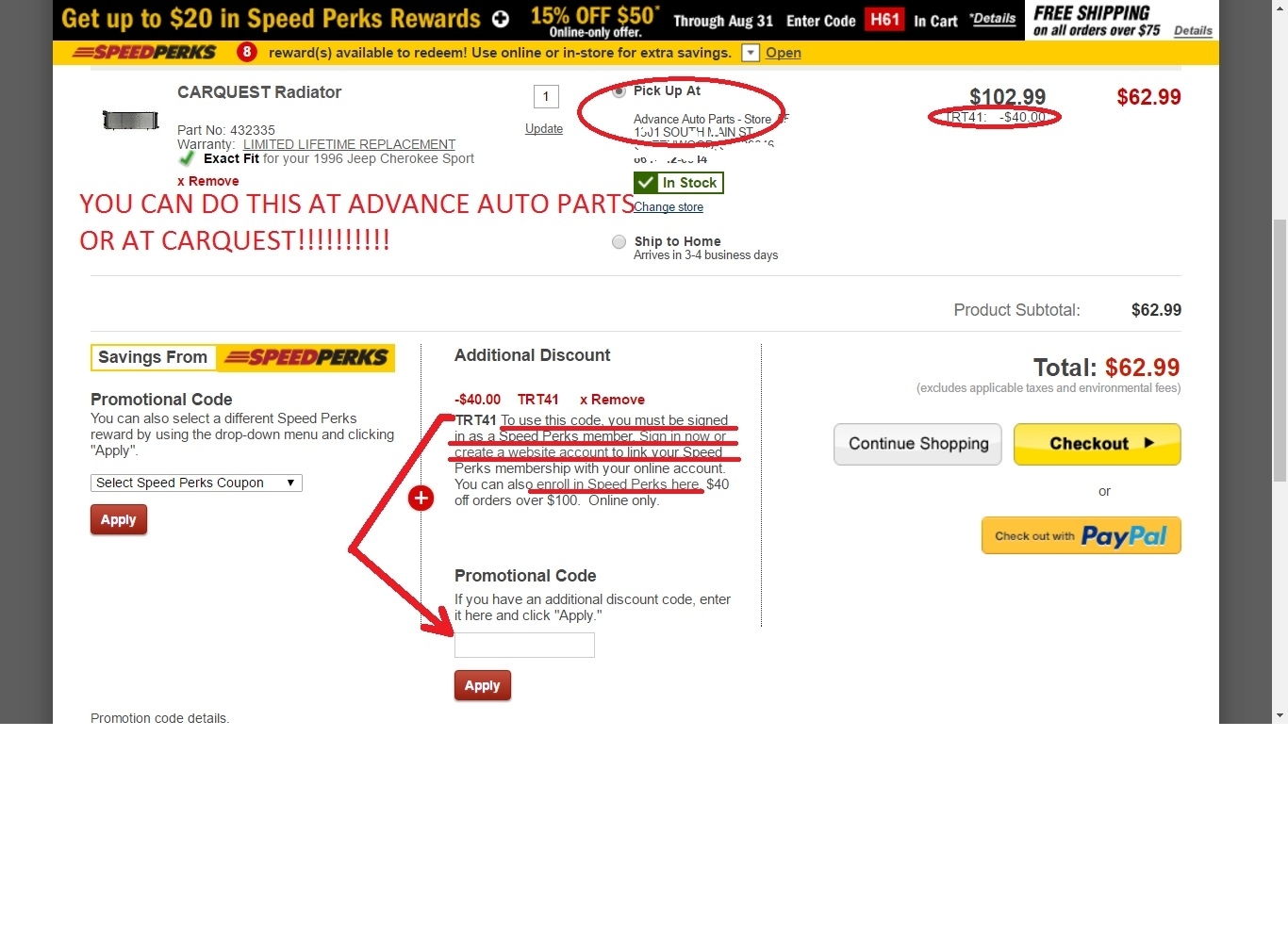 Find the radiator at either Advance Auto Parts or Carquest/ add to cart/ enroll in "Speed Perks"/ use promo code "TRT41 in promo box, the apply/ watch $40 drop on price/ select nearby store to pick up from in 30 minutes/ MAKE SURE ALL OF THE INFO IS CORRECT!/ GO TO CHECKOUT/ PAY ONLINE/ IN 30 MINUTES PICK UP YOUR PRIZE!