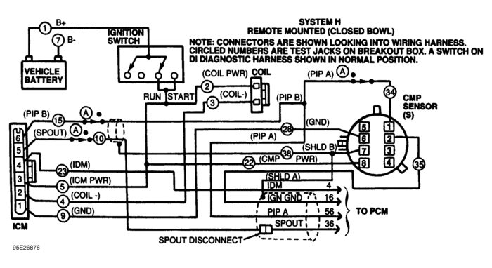 Check For ICM Power Turn ignition off. Connect EEC-IV Diagnostic Cable (007-00097) to EEC-IV Breakout Box (T83L-50-EECIV), negative battery terminal and ICM. See Fig. 6. Ensure PIP OPEN/NORMAL/SPOUT OPEN switch is in NORMAL position. Put DI overlay on breakout box.