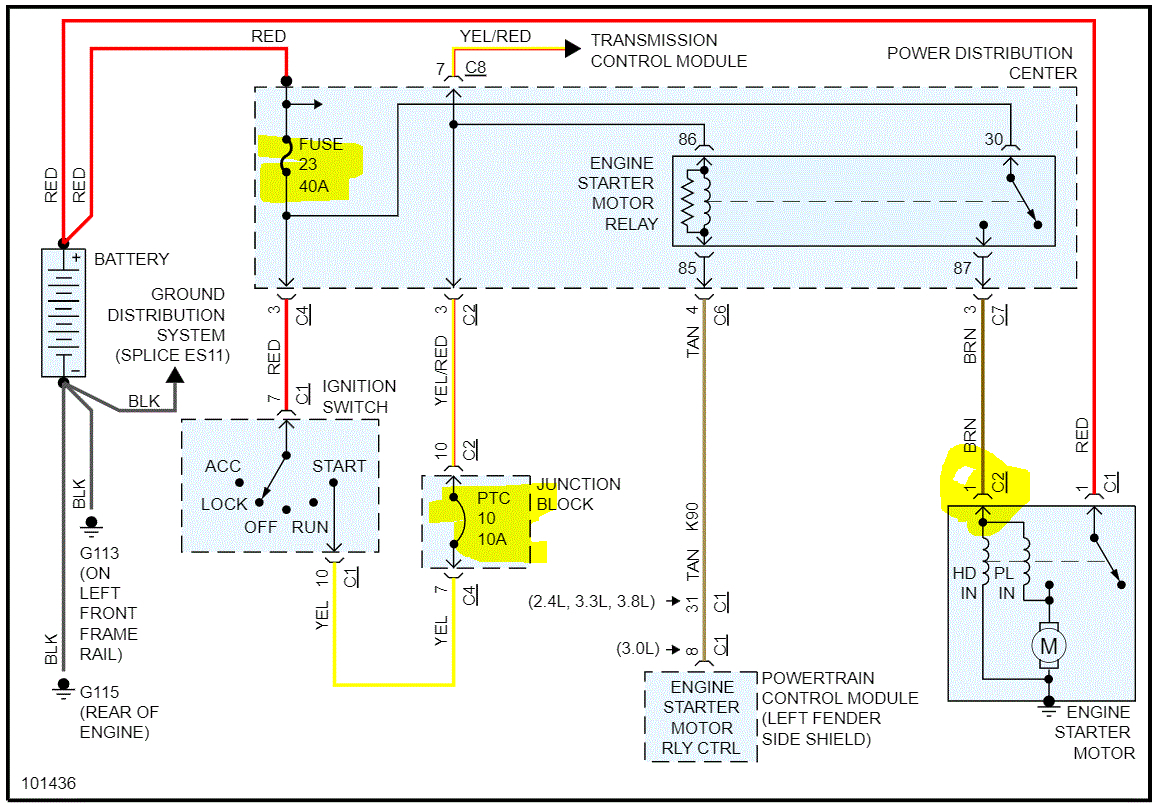 I attached a copy of the starter system wiring schematic for your reference. (Pic 1) Pics 2 and 3 are the fuses/relay to check. Pic 2 is under the hood. Pic 3 is in the vehicle.