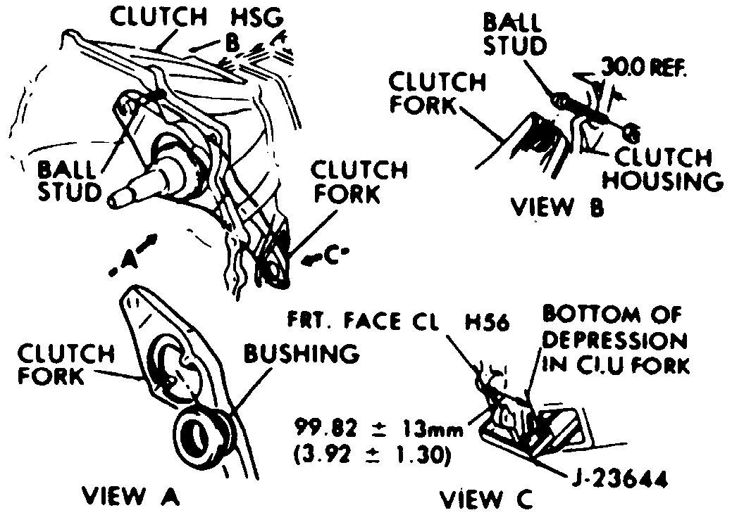 a. Place gauge J-28449 with flat end against clutch housing front face and the hooked end positioned in the bottom depression of the clutch fork, Fig. 4.