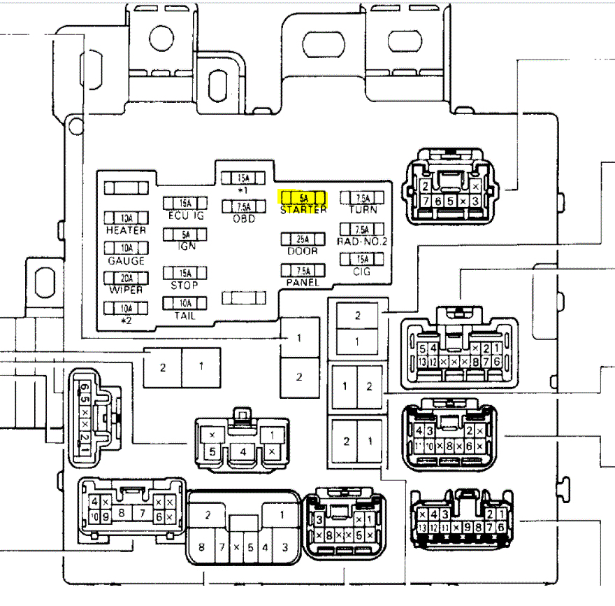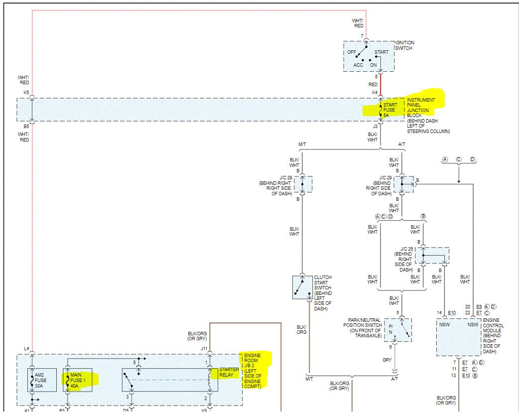 Here is what I need you to do: I attached the entire wiring schematic below for the starting system. I highlighted fuses and a relay that I need you to check. When checking the fuses, make sure there is power to and from them. As far as the relay, if there is a different one in the box with the same part number, switch them. If not, here is a link that shows how to check it. Also, link two may help when checking the fuses.