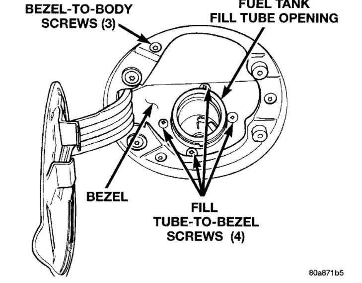 5. The fuel fill tube assembly is mounted to a plastic bezel behind fuel fill door. Remove 3 bezel-to-body mounting screws (Fig. 40). Do not disconnect fuel tubes from tank at this time.
