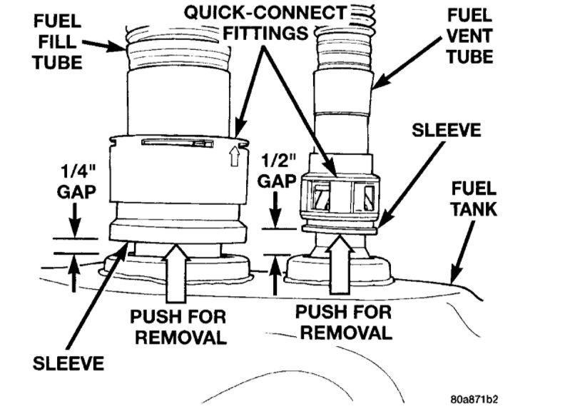 After verifying good connection, gap from bottom of fuel fill tube sleeve to top of tank fitting should be approximately 1/4 inch (Fig. 42).