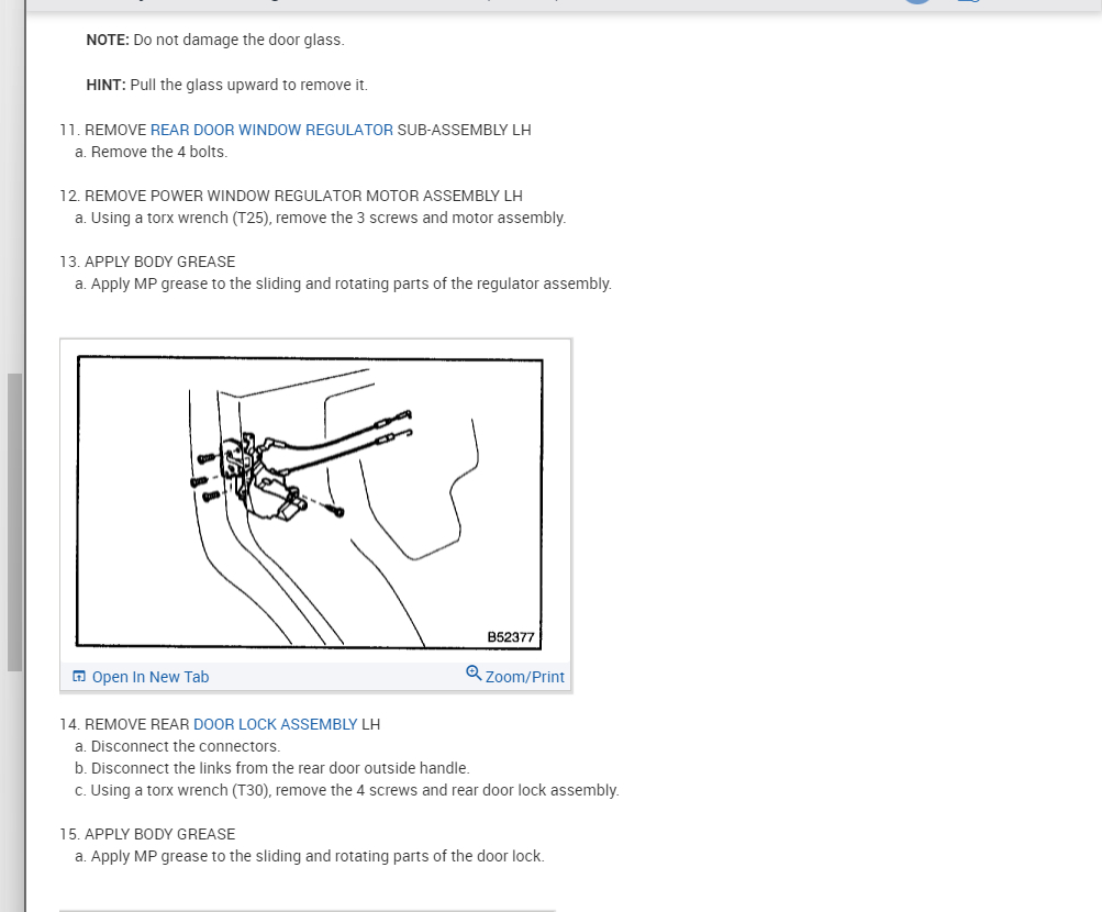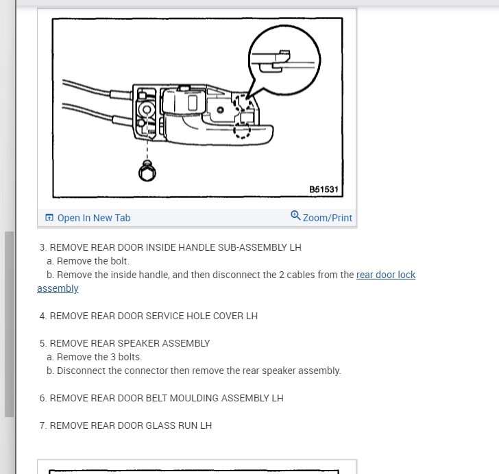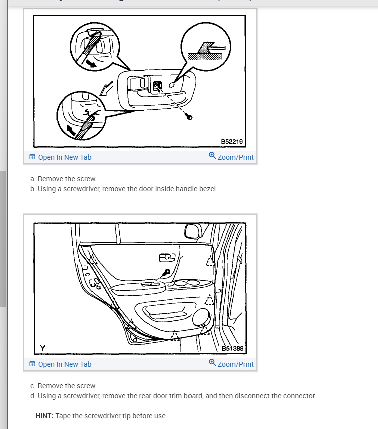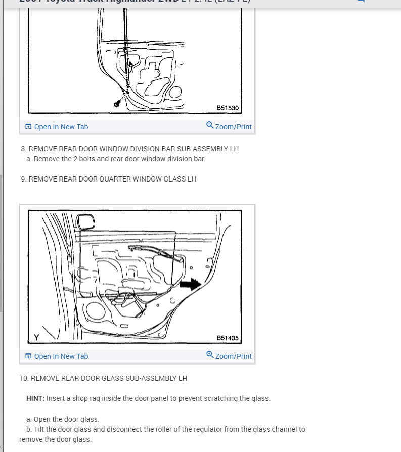 The driver rear window is off track in a 2001 Toyota highlander. I go to hit the window down button and the window motor goes but the window itself does not! I need to get the driver back door inner door panel off to get a visual. If you could provide me info on how to get the door panel off and what to do in order to get the window back on track id appreciate It. Thank you
