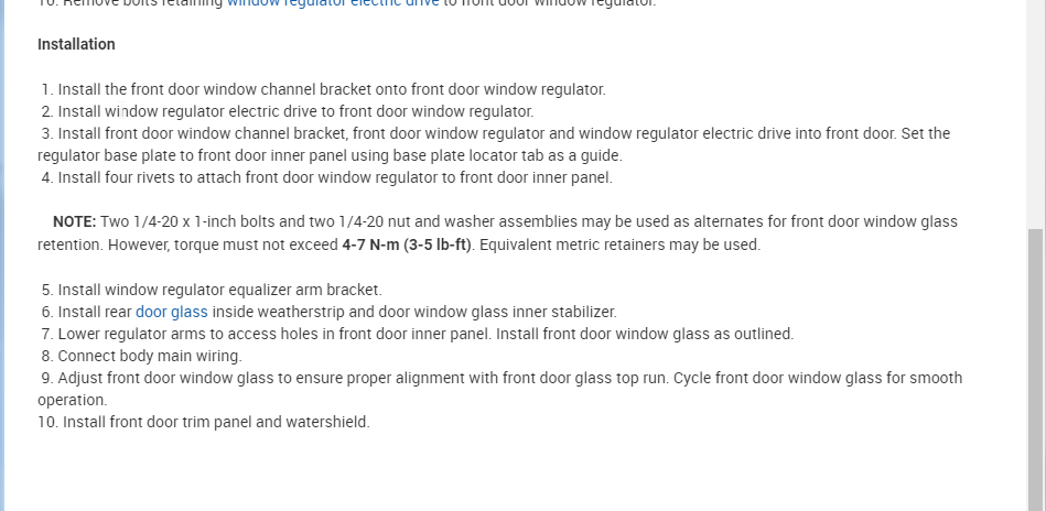 NOTE: Two 1/4-20 x 1-inch bolts and two 1/4-20 nut and washer assemblies may be used as alternates for front door window glass retention. However, torque must not exceed 4-7 N-m (3-5 lb-ft). Equivalent metric retainers may be used.