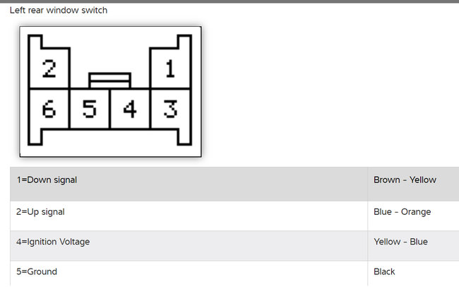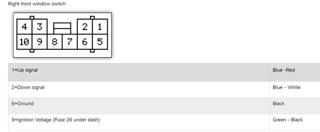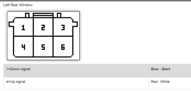 Now let's start at the window switches themselves. In the diagrams below I have included diagrams explaining what each pin in the window switches control and how to test to see if you have Battery + 12 volts at them. This will be our starting point. If Battery + 12 volts is present at the switches, then we will know that we will have to move down the circuit to the motor side. If Battery + 12 volts is not present at the switches then we will work our way back up the circuit towards the fuses to see where the break in the circuit is,