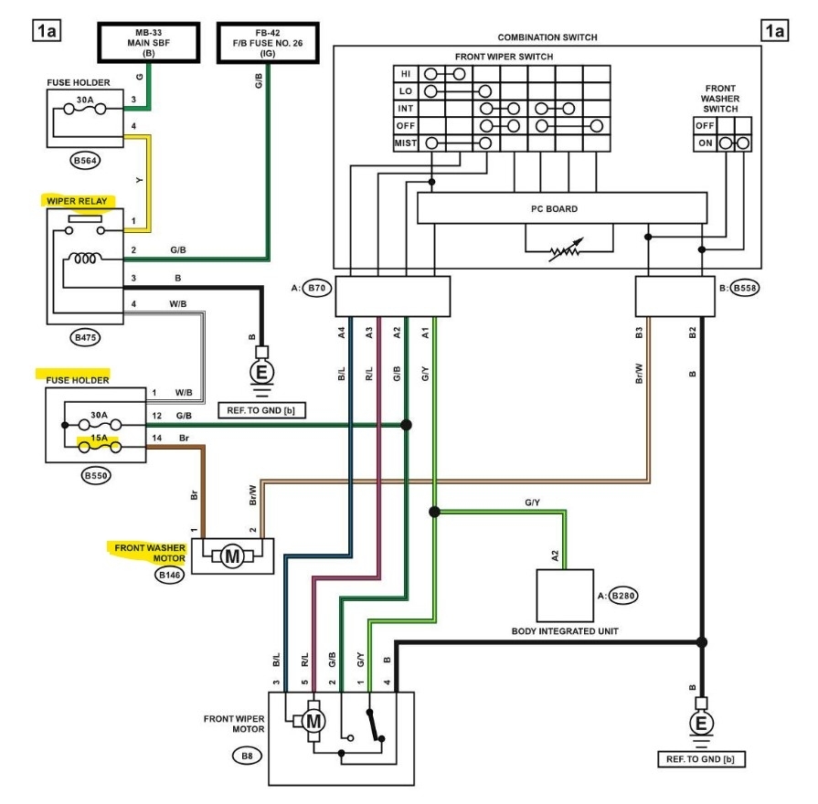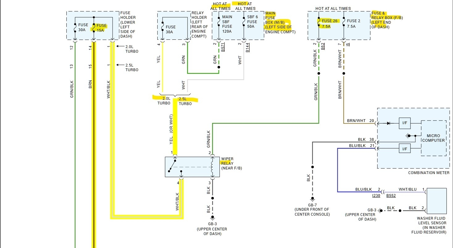 Hello, the 1st diagram is the oem Subaru wiring for the front washer motor, the 2nd and 3rd (top & bottom) are the aftermarket diagrams, I added them just because they give the location of the fuses you need to check, but the aftermarket diagram looks to be incorrect where the Wiper relay power comes in, but since your wipers work, you can just ignore that section and use those diagrams to locate the washer fuses.