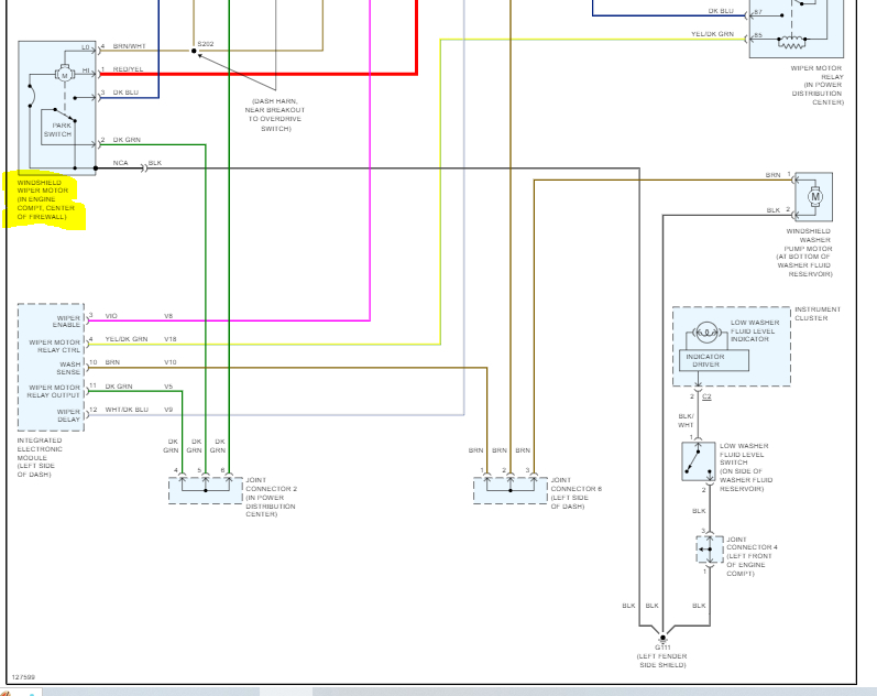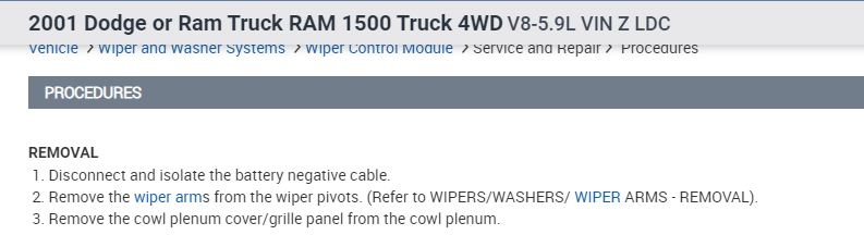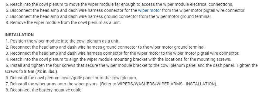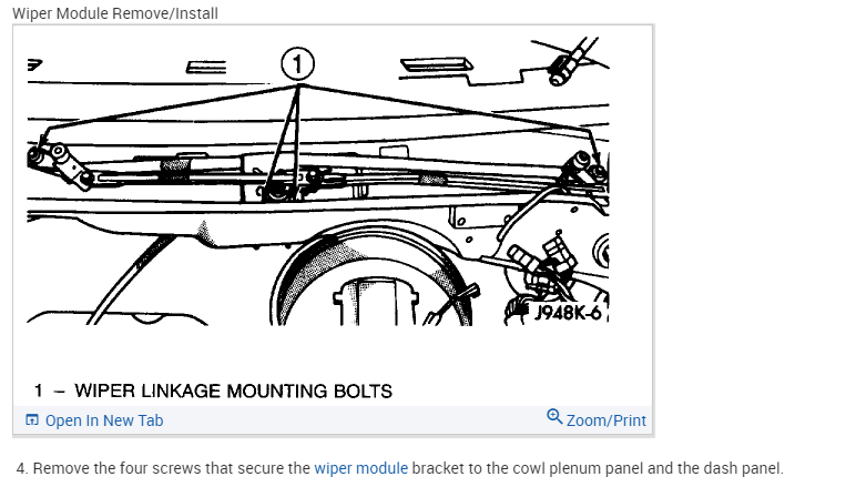 Also, the wiper motor is centered under the cowl at the base of the windshield. You need to remove the wiper arms and cowl to access it. I attached the directions below for replacement. See the last four attachments.