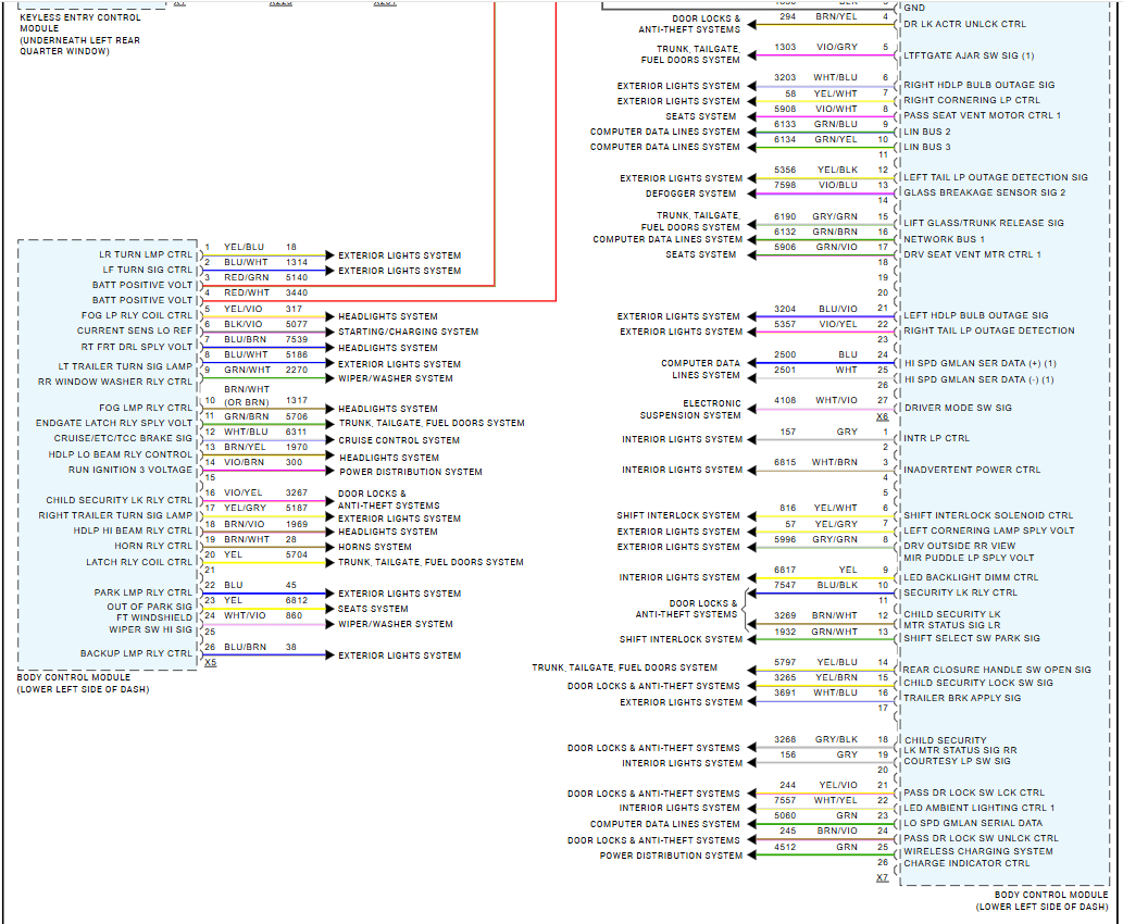 It comes equipped with K4C but the wireless charging unit in the center console is not functioning. The module gets three wires in, GN (circuit 4512) which I verified at 12V, it has a good BK ground, and the last wire is VT/YL (circuit 5985 - accessory wake up). This last wire has no voltage so I'm thinking the module wont wake up without this LIN signal. All the circuits and pin numbers I found are from other similar vehicles manuals online so I'm looking for the actual 2017 suburban wiring manuals so I can nail down the exact BCM pin and check continuity.