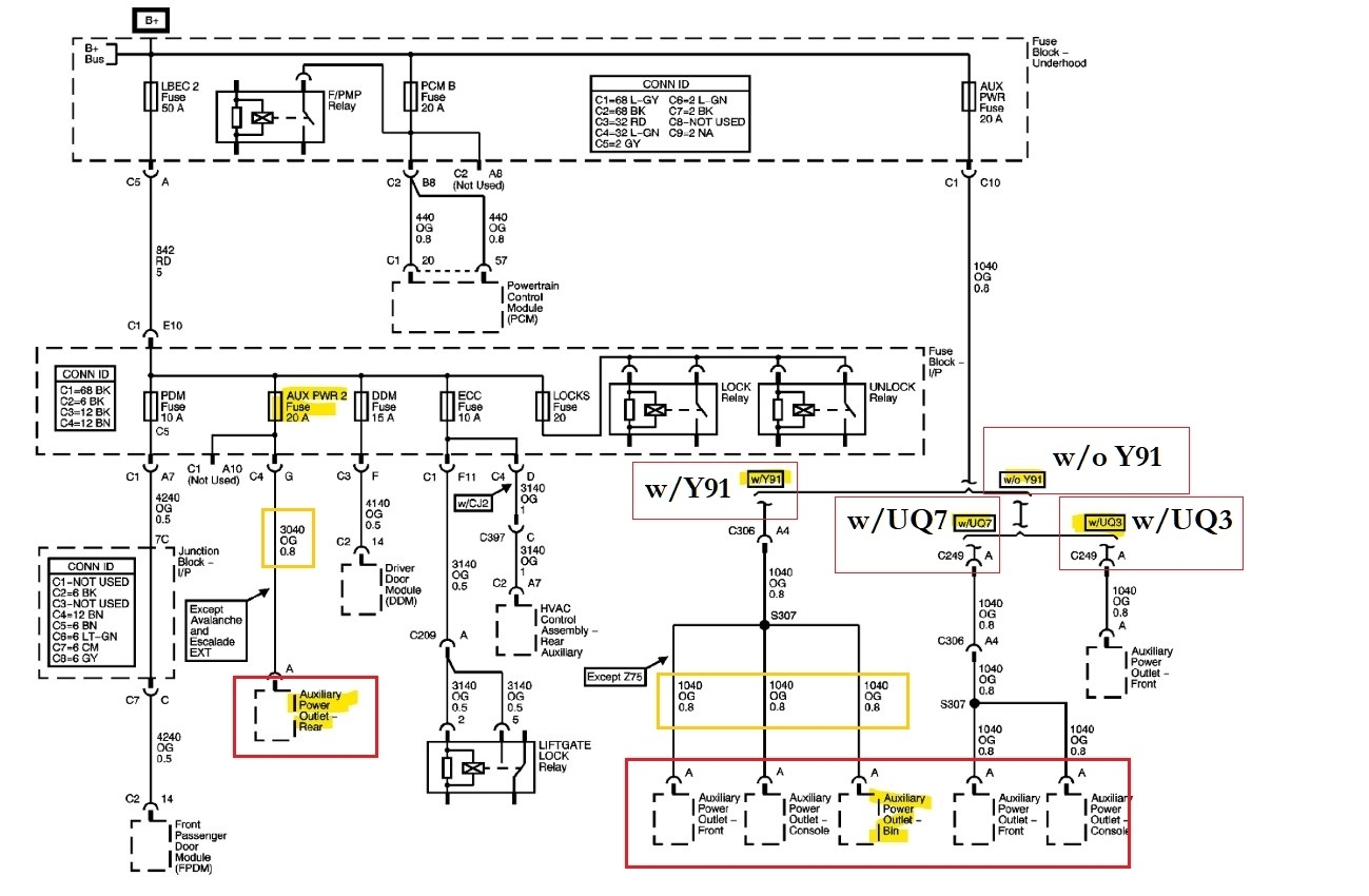 This is the oem wiring diagram which is labelled differently and might be more of what you are looking for. This is fed from the AUX PWR 2 Fuse 20Amp, to the Aux Power Outlet Rear on the left side of the diagram, but notice the other Aux Power Outlets have different RPO codes, there is a list of RPO codes (3 number/digit) codes which help to identify the components the vehicle may or may not have been built with. The RPO list will be somewhere on the vehicle, the owners manual should list where its located, and you are just looking to see if, for example in the list there is a Y91, which on the right side of the diagram branches off to a different set of Aux Power Outlets. But I would check the AUX PWR 2 fuse in the IP fuse block (dash fuse panel). See if that 20Amp fuse has power with the key on. But all the Aux Outlets have Orange wiring to them with what looks to be a Black wire for Ground. Let us know what you find or if you need any other info.
