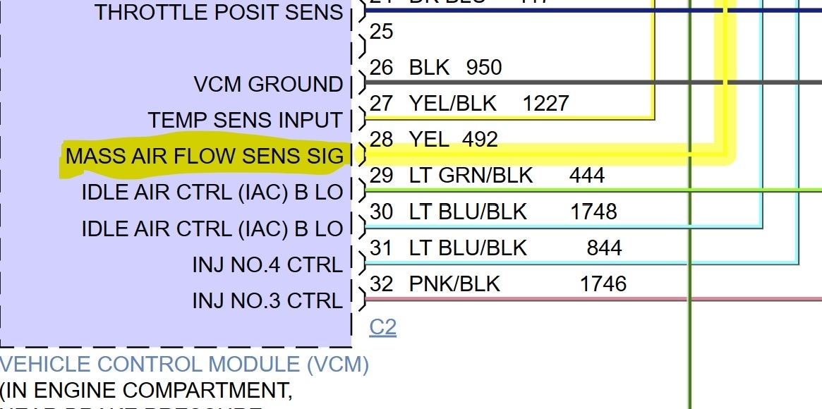 From what I see the VCM is not providing the power. The power is coming from the fuse box through a slice directly to the MAF. The yellow wire is the only one going to the VCM for the MAF signal. If you look at figure 8 it shows what that fuse gives power to. One of those is the MAF.