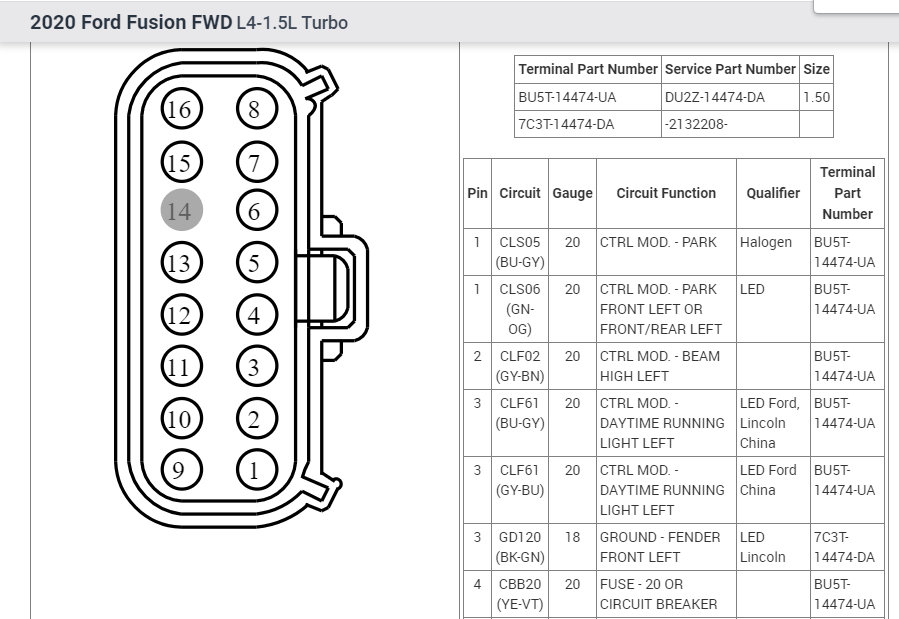There are two different connectors used. I have no idea why. I did find the 16-pin connector. I attached pics below that provide what you need. It is connector number C1509A.