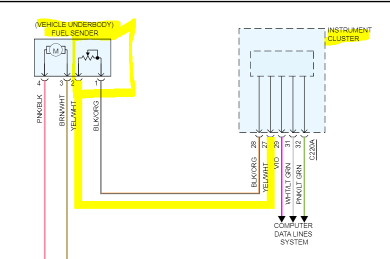 Hello all, my truck's fuel gauge is reading empty even after filling it all the way up, I took it in and was told the yellow wire is damaged and is the reason it doesn't read. I didn't think to ask where exactly it is, I'm curious as to see what others say before I call to see and if it's a fix I could do myself? I have some knowledge of working on vehicles but electrical is new. I appreciate the help!