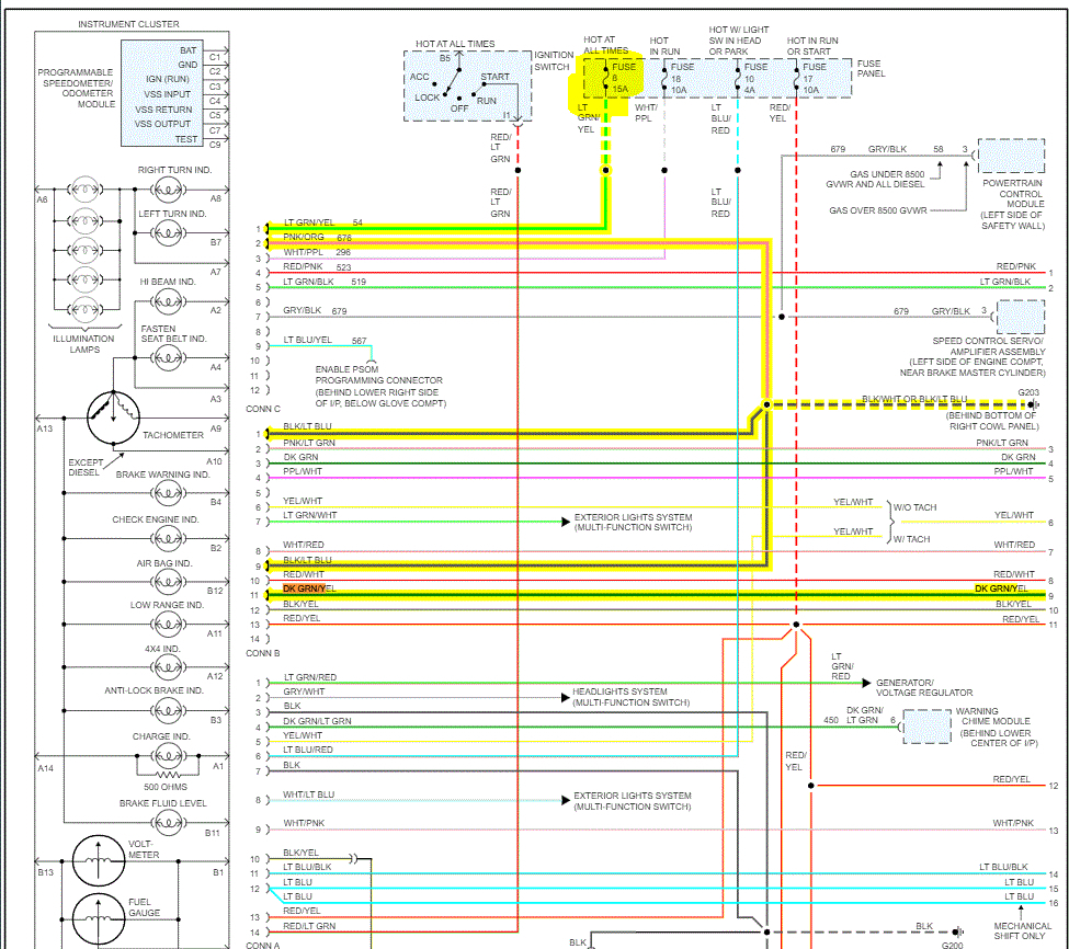 All other gauges work fine, as well as warning lights when I start the truck. I reviewed the wiring diagram in my Haynes manual, however it leaves a lot to be desired. I think I located the black wire with the light blue stripe and it is identified as a ground. Have not found what the green with yellow stripe wire is. Not sure about the accuracy of the diagram though. I will say, I checked all of the fuses related to any of the speed sensors, transmission controls, etc. And all fuses are fine. I cannot figure out what is wrong. I would appreciate some guidance. Thank you
