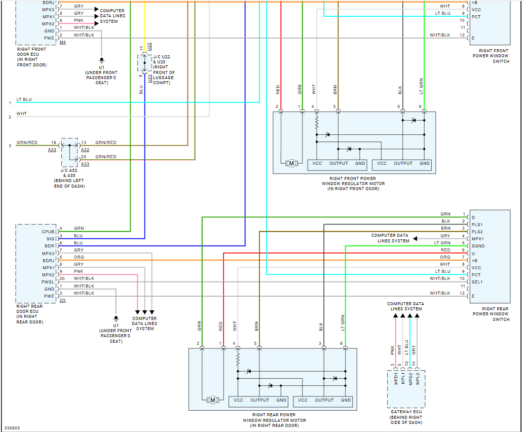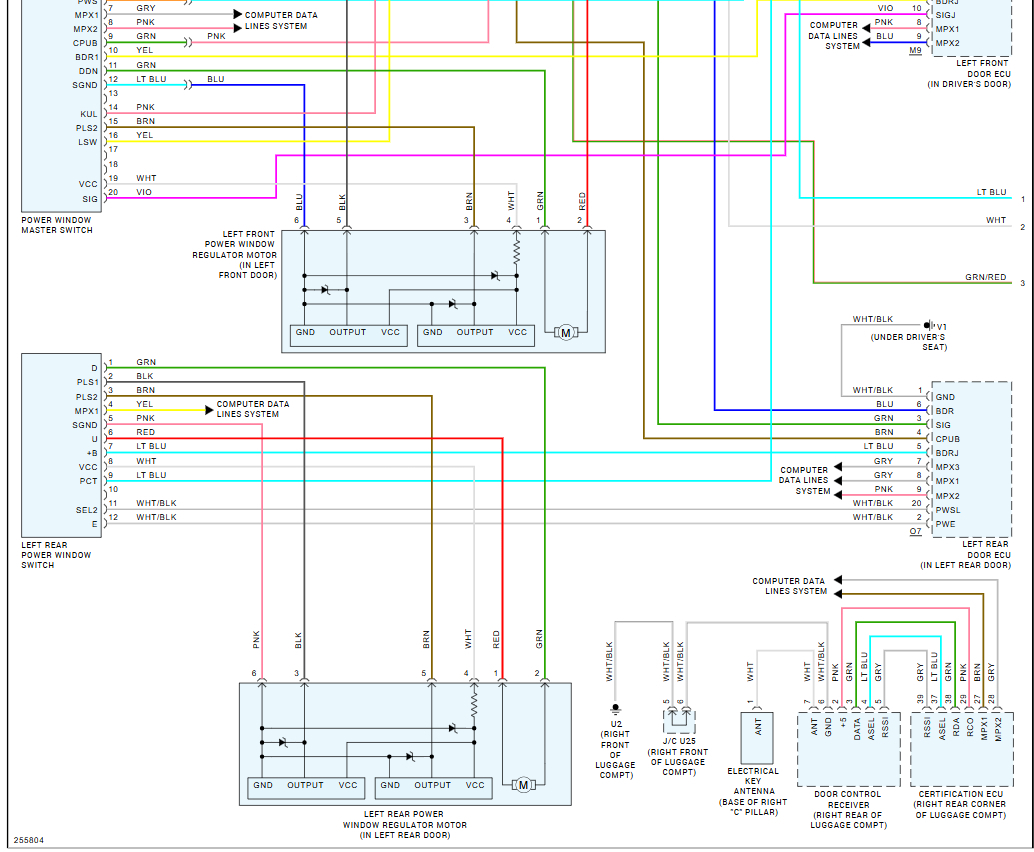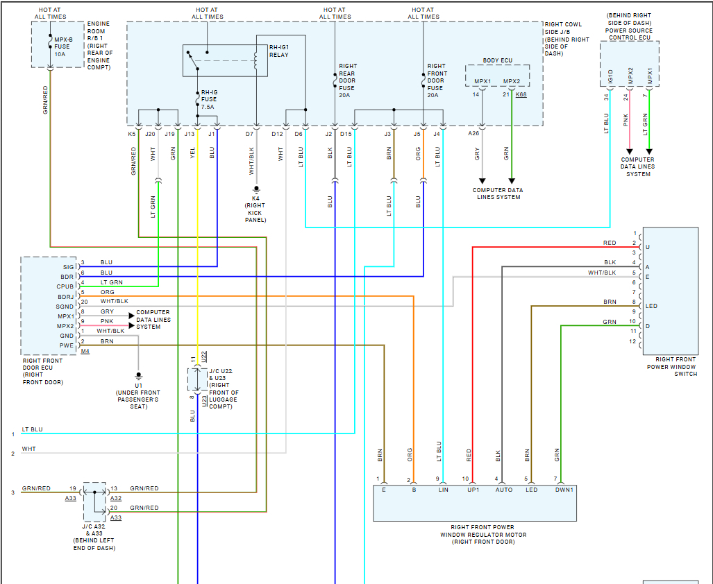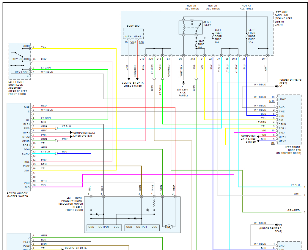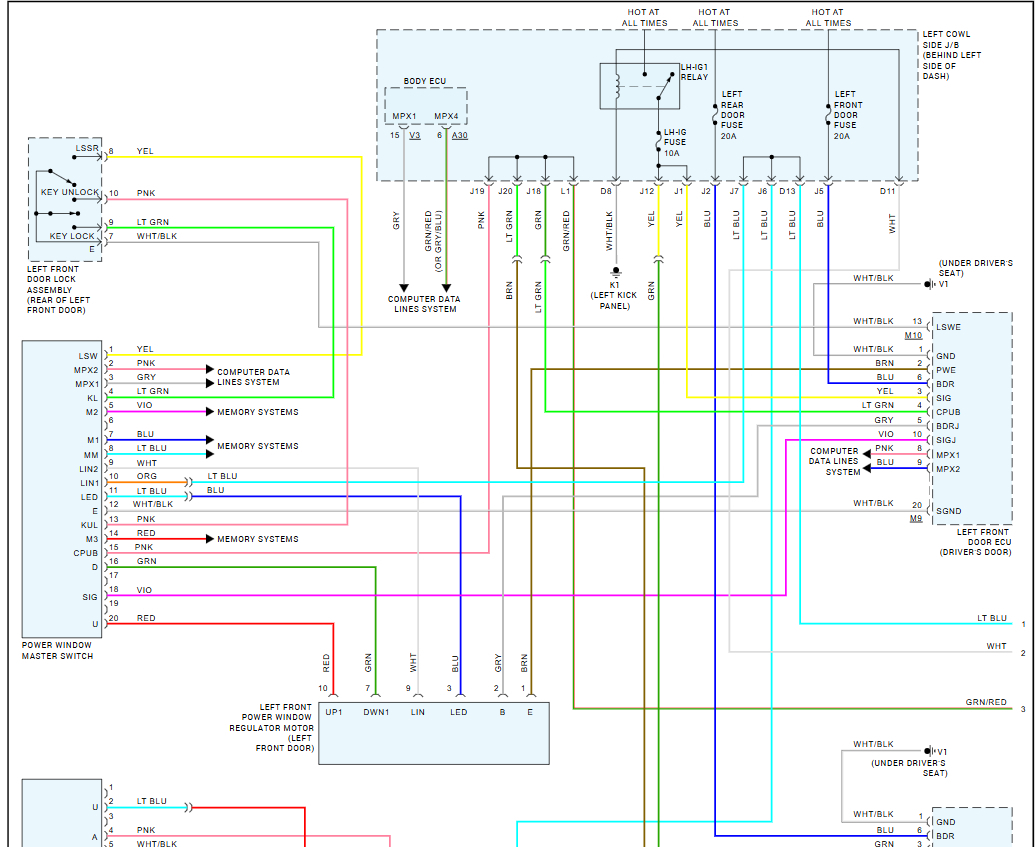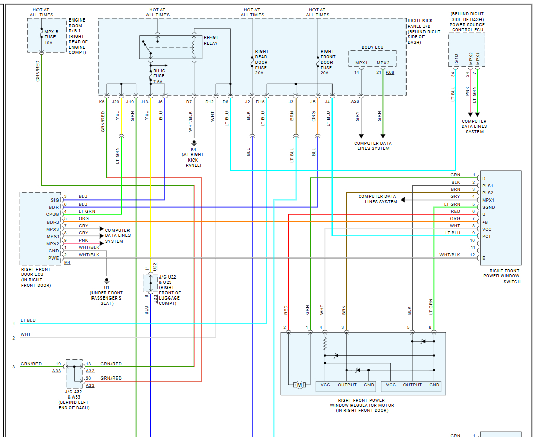 I need a schematic diagram of a 2007 Lexus GS 350 Front Left Driver Door and a schematic diagram of a 2010 Lexus GS 350 front left driver door diagram of the wiring harness on the door behind the door panels. I’m trying to splice my harness from a 2007 GS 350 door to the 2010 wiring connector for window regulator. Both harnesses have same wires which are 6 wires together but 2 of them are different colors, the 07 harness being a red and green wire while the 10 harness being a black and brown wire. Them 4 wires are all thick wires while the others are thin.