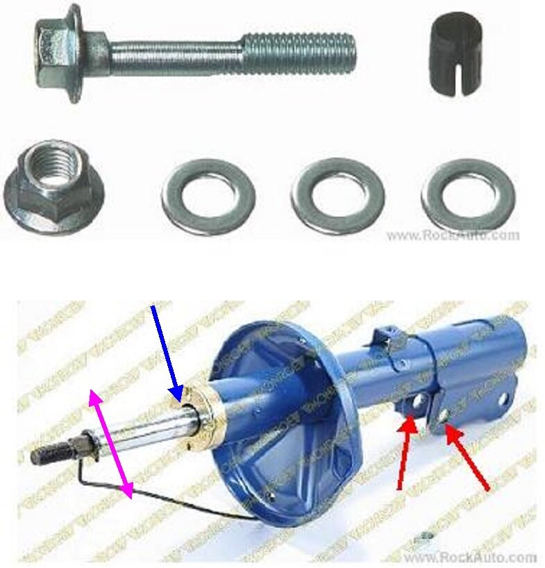 This photo shows a typical strut. When they're worn to the point of clunking and wobbling, the hole at the top of the body, (blue arrow), becomes elongated. When you feel that movement when tugging on the tire, the shaft is moving back and forth in that elongated hole, (purple arrow). The oil inside will have leaked out a long time ago before it gets this bad, so that corner of the vehicle would have been bouncing for a long time.