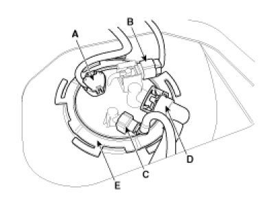 2. Disconnect the electric pump wiring connector (A) and the fuel sender connector (B), and then remove the fuel sender (C).