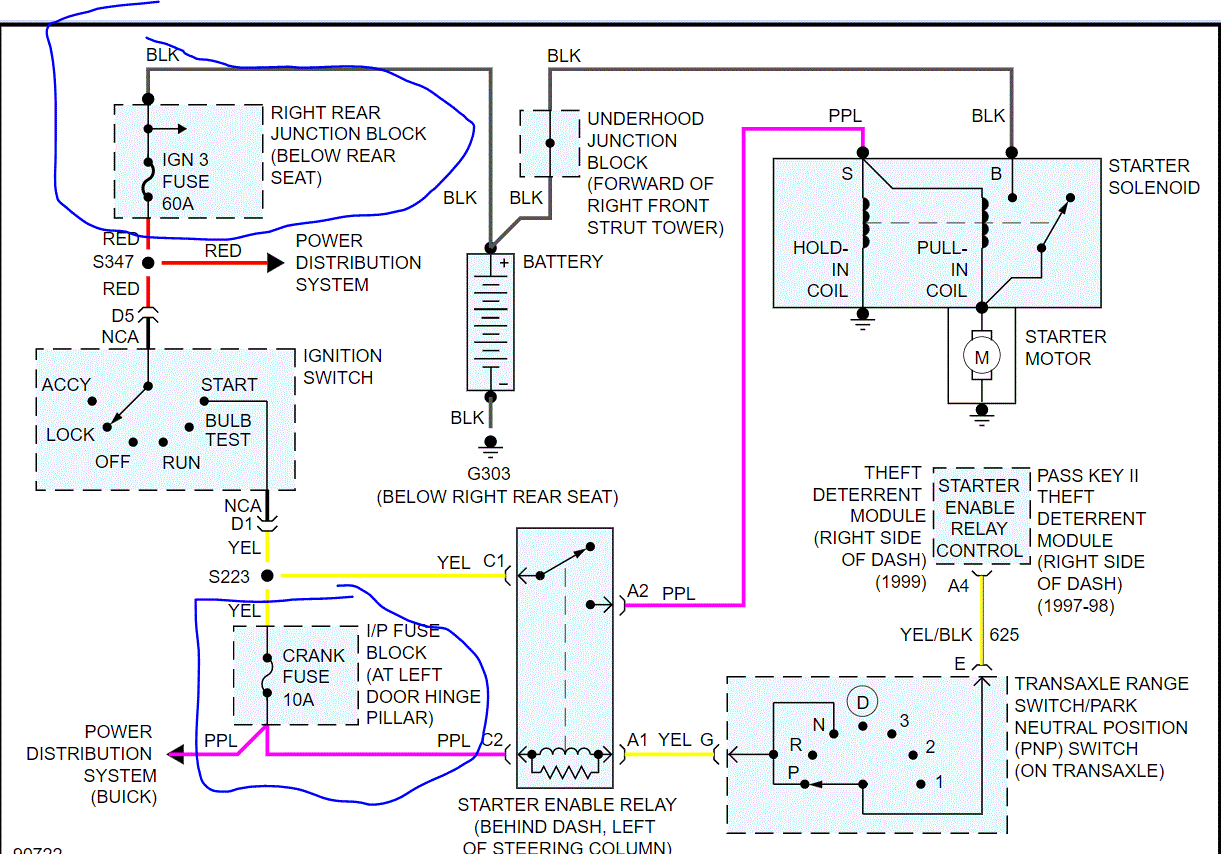 The purple wire will be on the starter itself. If it has power when the key is in the start position, the battery is charged, and the connections are all good, it sounds like you have a bad starter. If you look below at pic 1, I highlighted the purple wire on the starter.