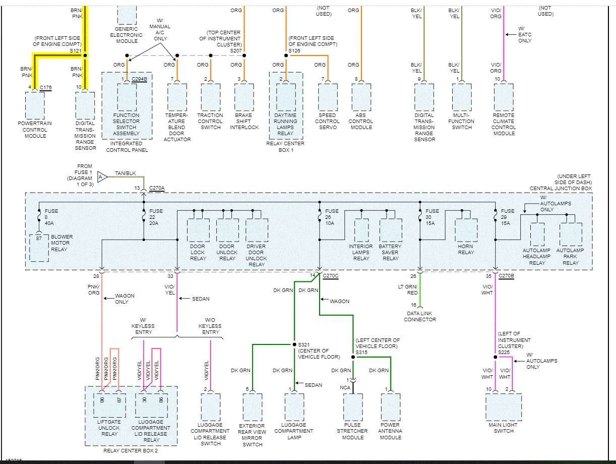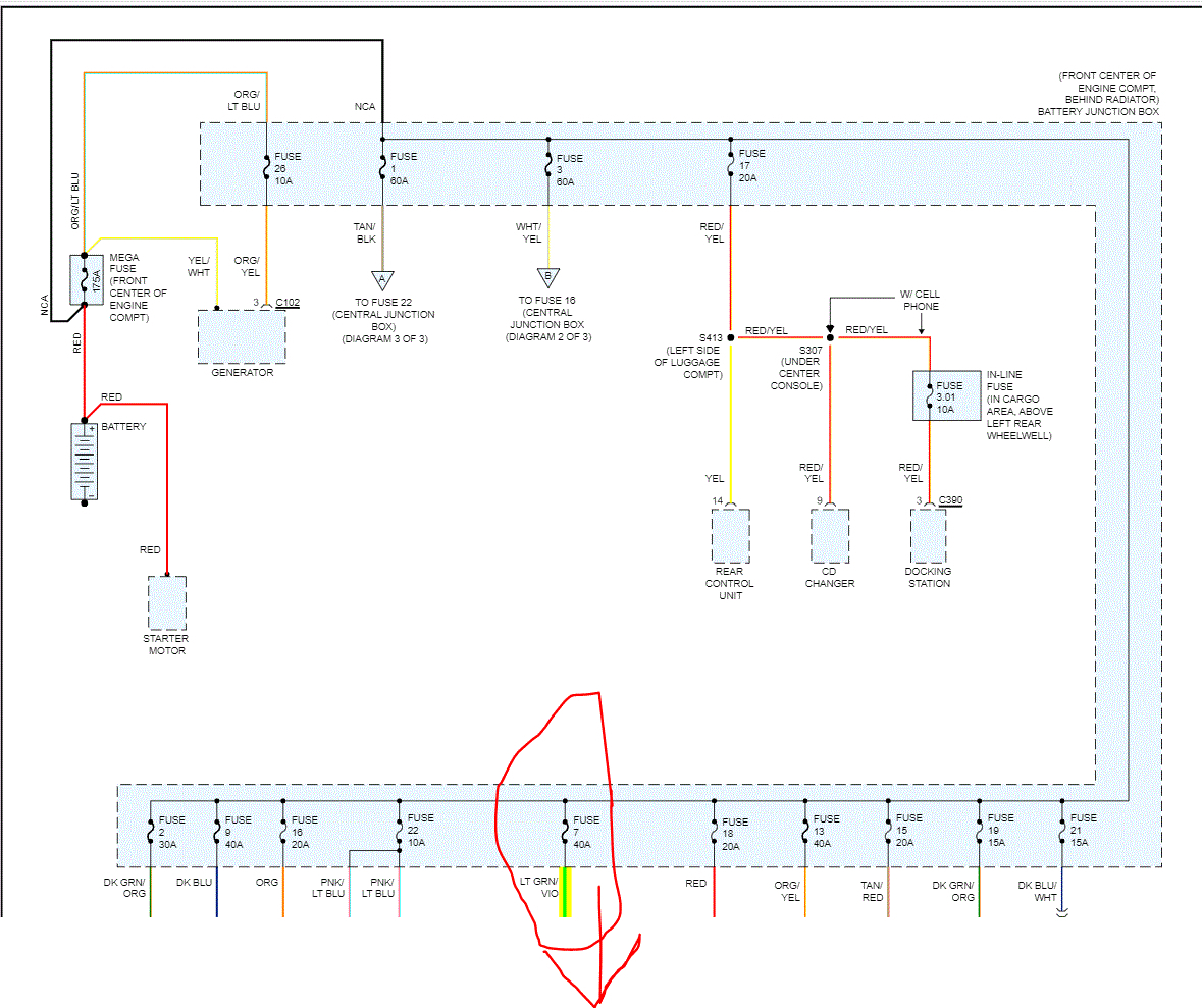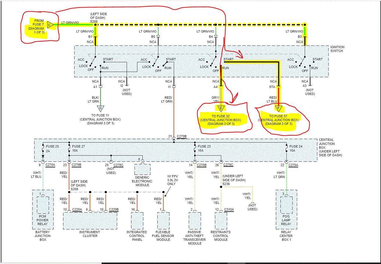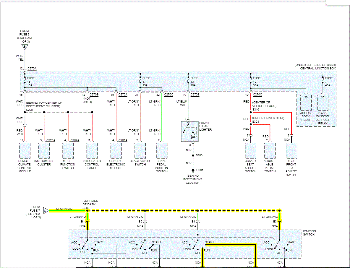 See pics below. Note: The schematics were three pages long. I had to cut each one in half to make them readable for you. I did overlap them and highlight everything for you to follow. The last two pics show the fuses to check.