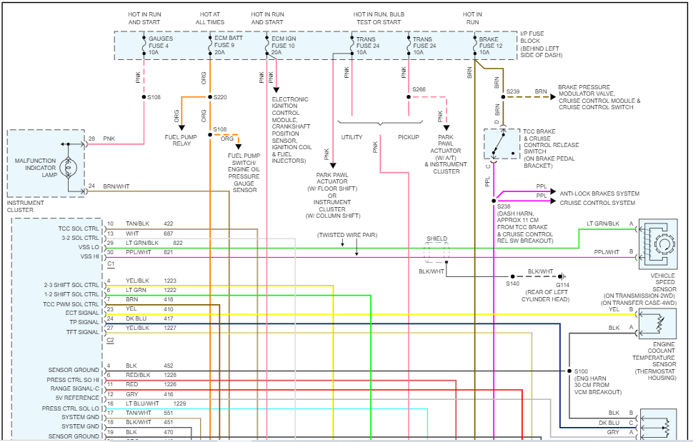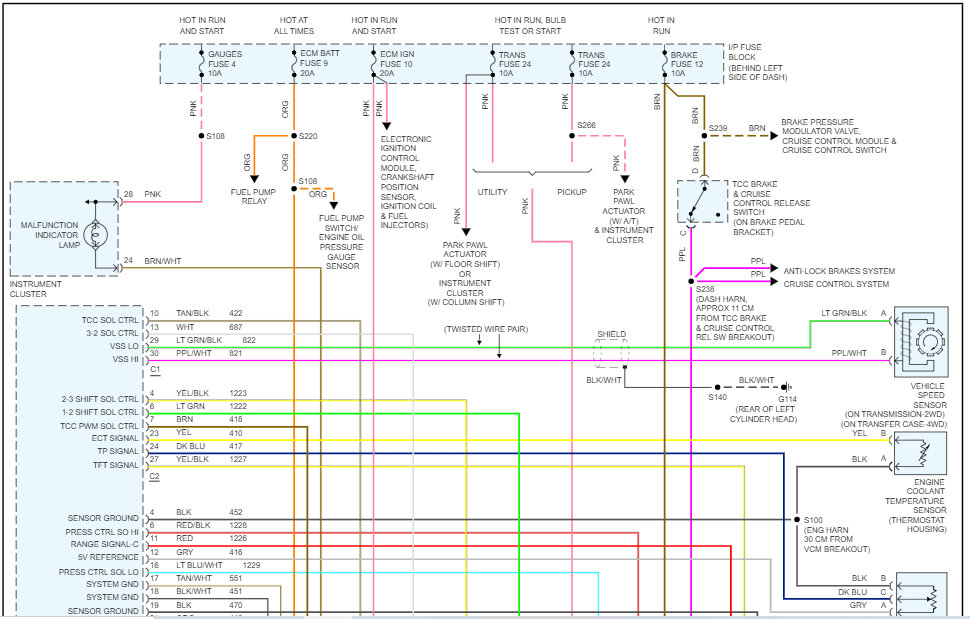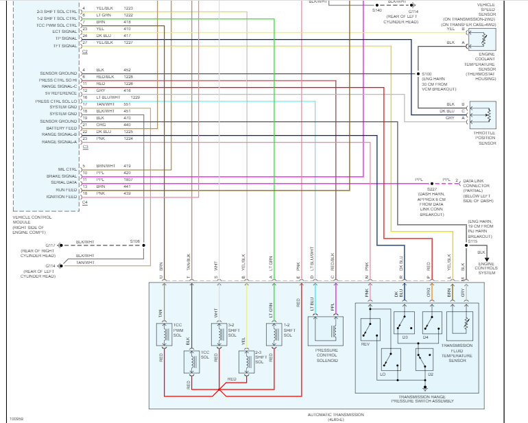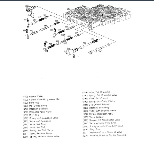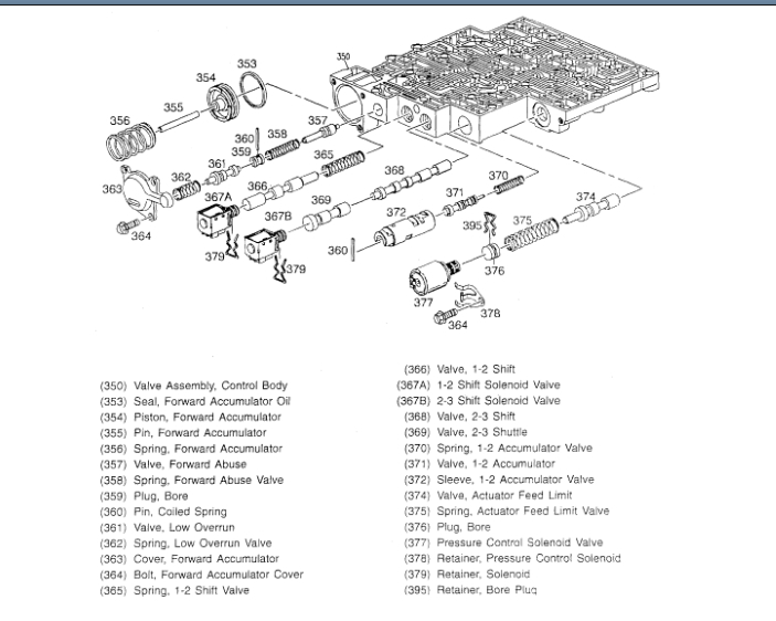 Pics 3 and 4 are exploded views of the valve body and its components including valves and solenoids. Pics 5 and 6 are the wiring schematic of the transmission electronics. Note that the two pics came from one page. I had to cut it in half to make it readable.