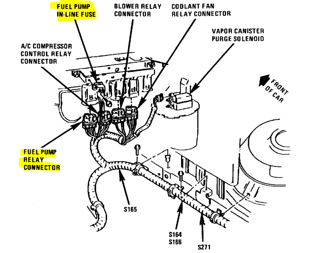 Do me a favor, check the fuel pump relay and the fuel pump inline fuse. I realize the fuse has to be good for it to work at all. However, if it is loose or corroded, it could lose connection. Also, if you haven't checked the relay, check that. The Fuel Pump Relay is located in the right hand front of the engine compartment, on the relay bracket. See pic below