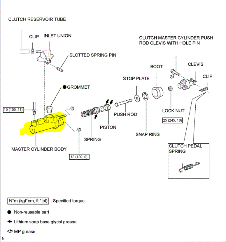 The clutch on this vehicle is hydraulic. Brake fluid is fed to the clutch master cylinder from the brake master cylinder. First, confirm the brake fluid is full.