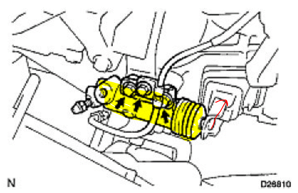 Next, with the hood open, look on the transmission near where it connects to the engine for the slave cylinder. I attached a pic below (pic 2) to help. I highlighted the slave. I have a red arrow pointing toward the transmission. When you press the clutch, that slave cylinder pushes the metal rod outward which moves the release bearing on the clutch assembly and disengages the transmission. Check for leaks. If there are none, have a helper pump the clutch pedal while you watch that metal bar and slave for movement.