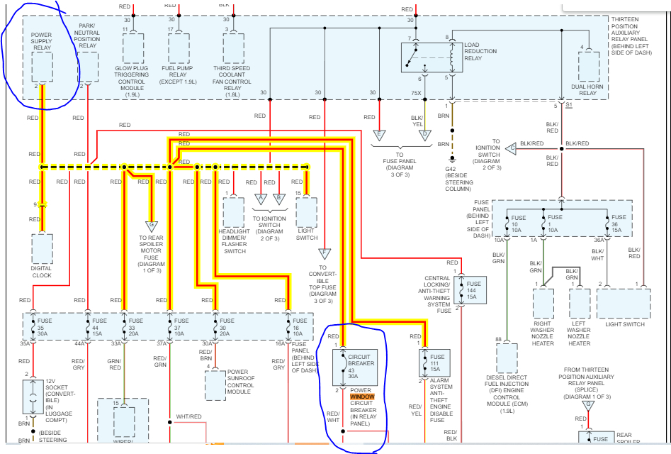Pic 3 is from the power distribution schematics showing the circuit breaker for the windows and the relay. Pic 4 shows the relay in question. It is located in the relay box under the dash on the driver's side. Check that relay.