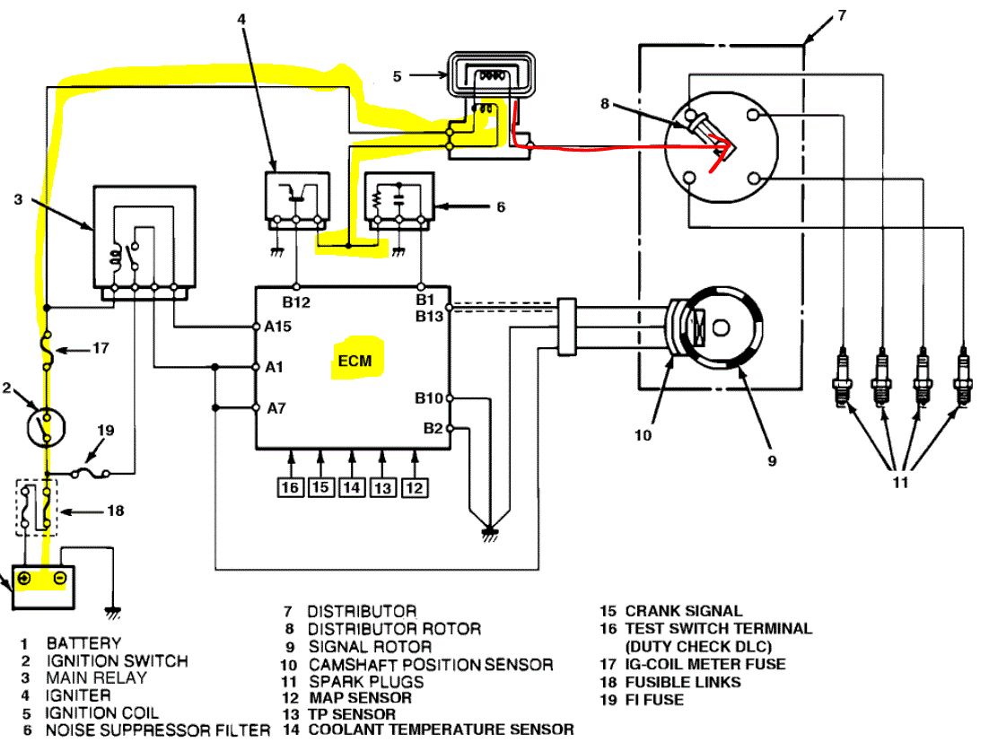 I attached a schematic below showing how the system works. Power comes from the battery to the + on the coil. From there, power is grounded via the ECM. When the ECM removes the ground, power finds the next easiest path to ground, and that is to the spark plugs. The signal (removal of ground) is initiated by the signal rotor/camshaft position sensor (which is in the distributor).